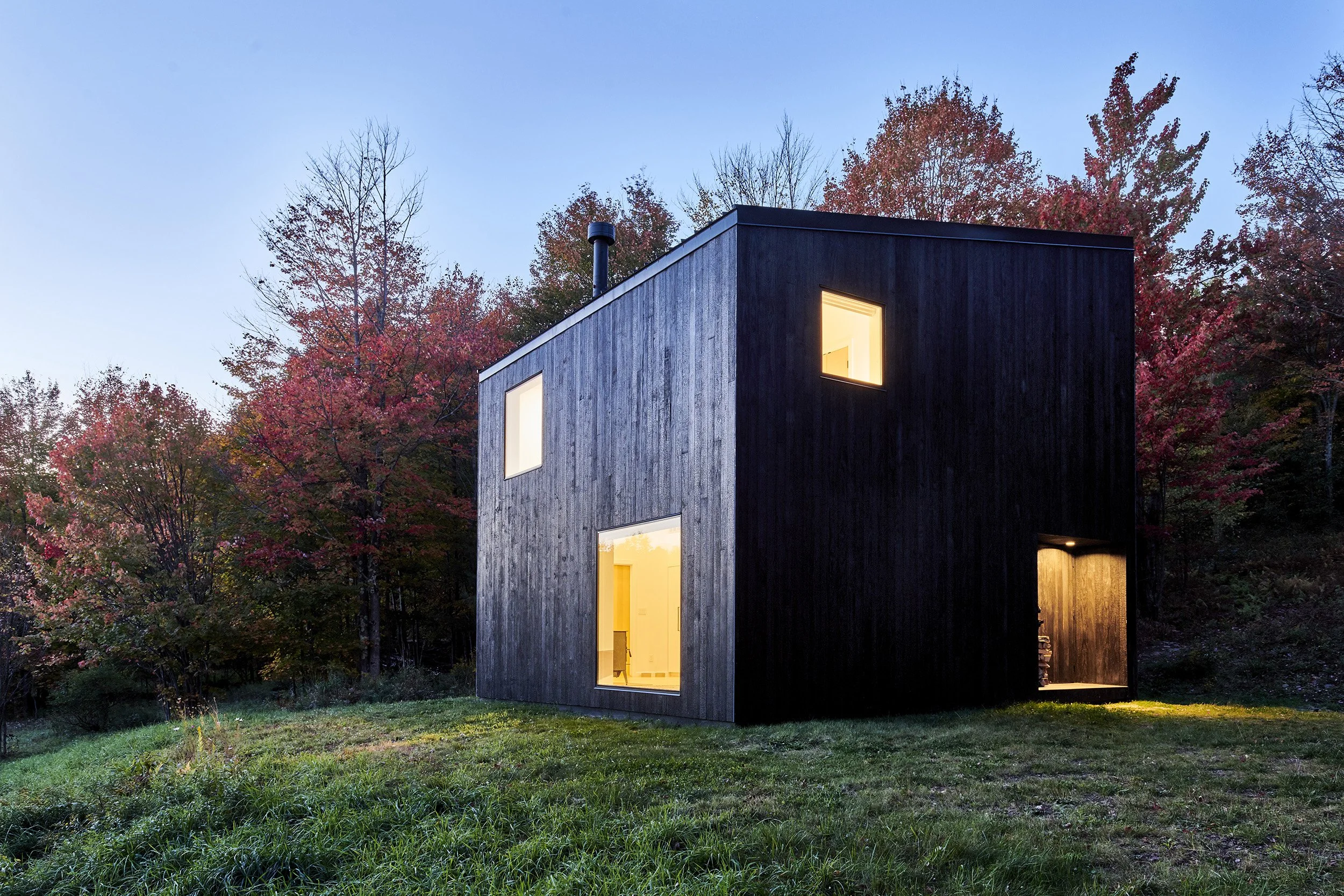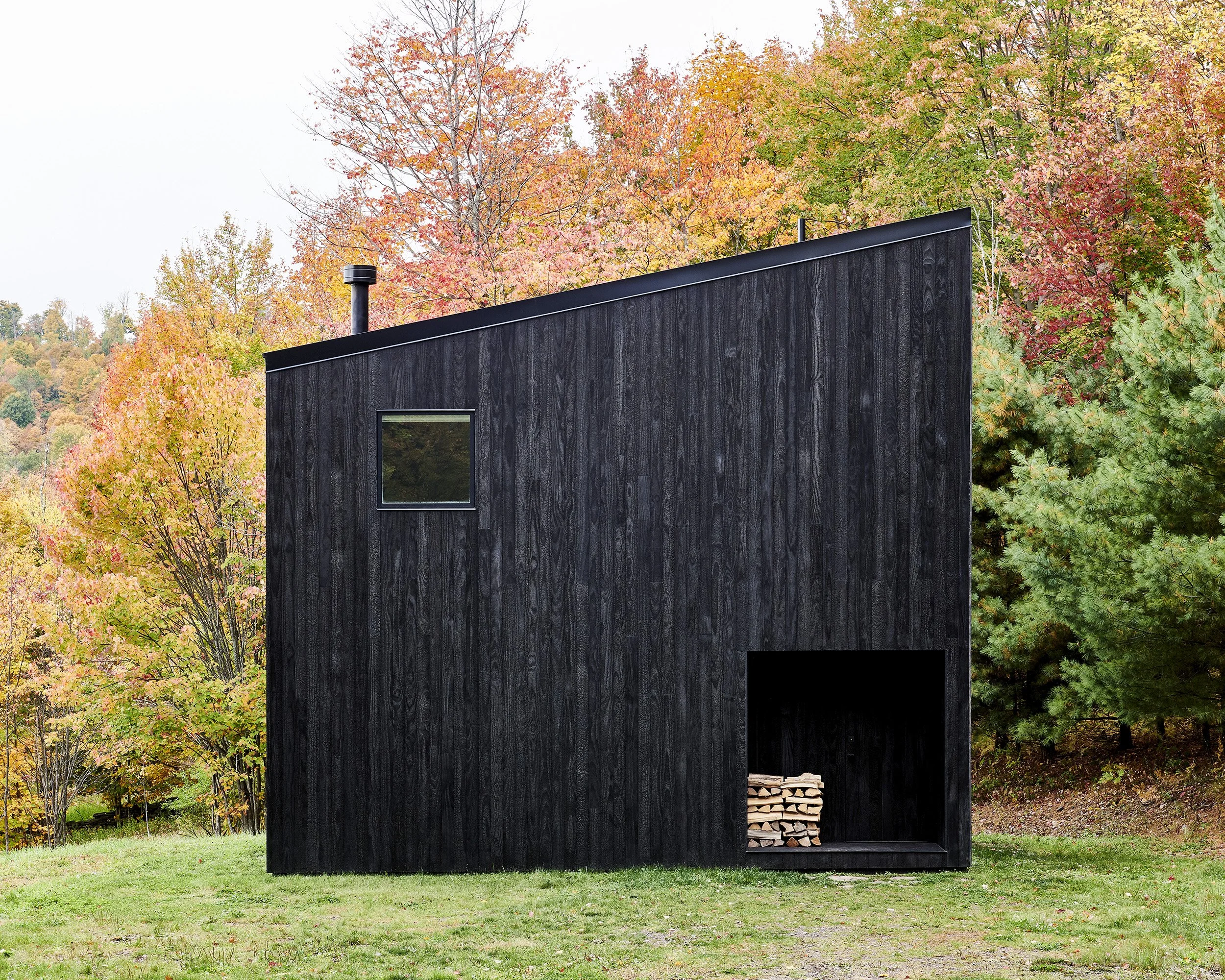 The re-purposed slab foundation, locally sourced finish materials, and limited disturbance to the former agricultural site imbue the project with a spirit of reclamation and reinvention. Carefully arranged punched windows frame unique views of the mountains in the distance. Meanwhile, the use of charred cladding as the primary exterior finish material pays a curious homage to the previous structure that occupied the property but was mysteriously lost to fire- another reclamation of a small piece of local history.
