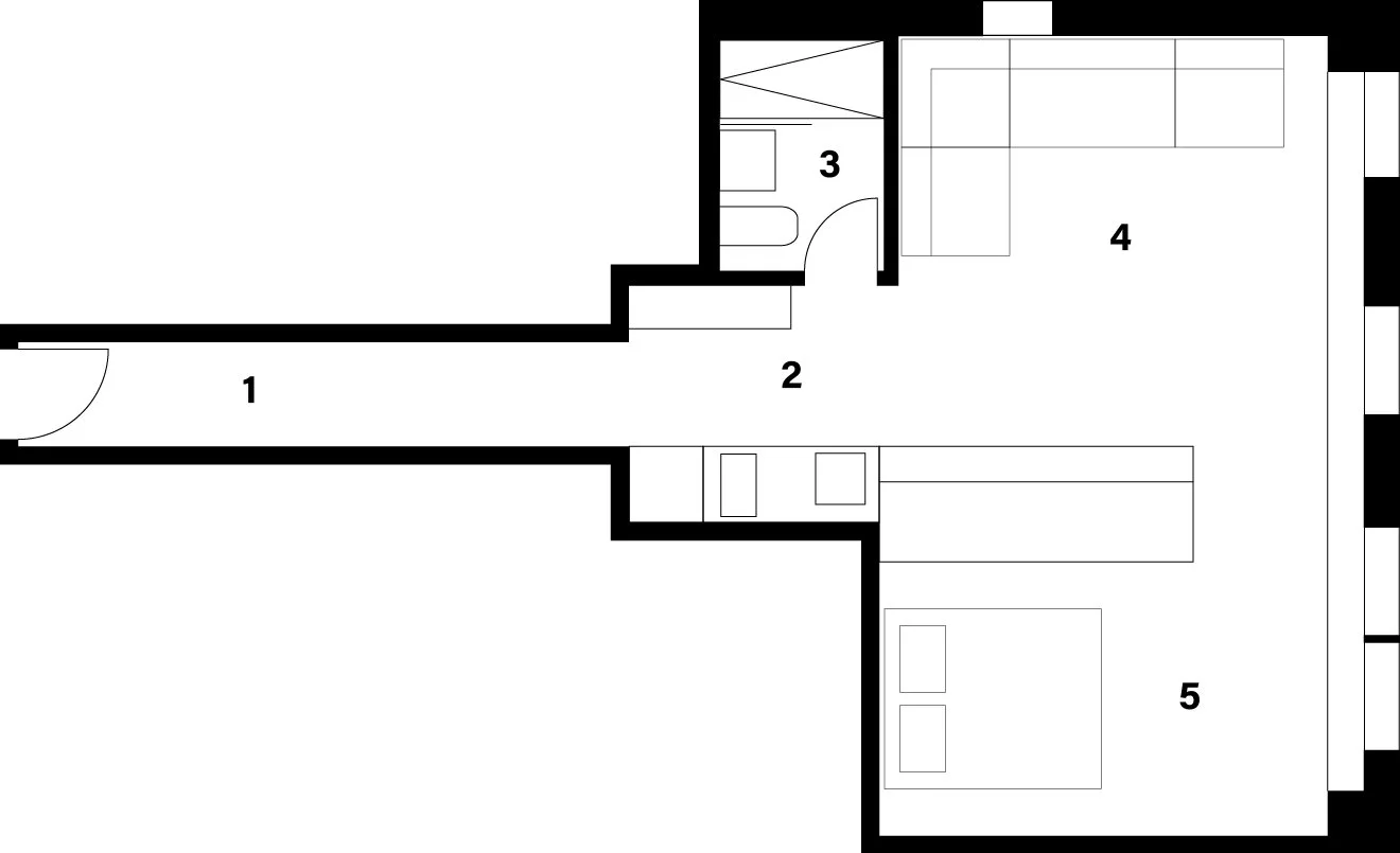 57 Thompson Street includes the renovation of a pre-war residential unit in the Soho neighborhood of lower Manhattan. Formerly used as a painting studio, the design brief included the mandate to subdivide the single studio space to both maintain the existing open plan while accommodating subtle degrees of privacy between the new living and sleeping areas. Previously without a working kitchen, the new, micro-galley kitchen was designed for the utilization of every possible square inch. Together with clean, minimalist detailing, attention to efficiency, and an updated interpretation of a Soho studio, the design expresses practical restraint with a clever spirit of reinvention.